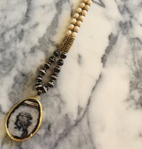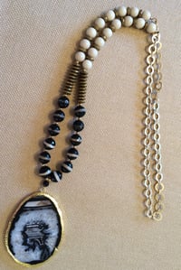 This funky fresh piece is sure to make a statement! She is made with cream jasper, faceted gold hematite, black & cream agate, a large agate slice pendant wrapped in gold edging and is suspended from a matte gold chain. She commands attention so be ready when you wear her!